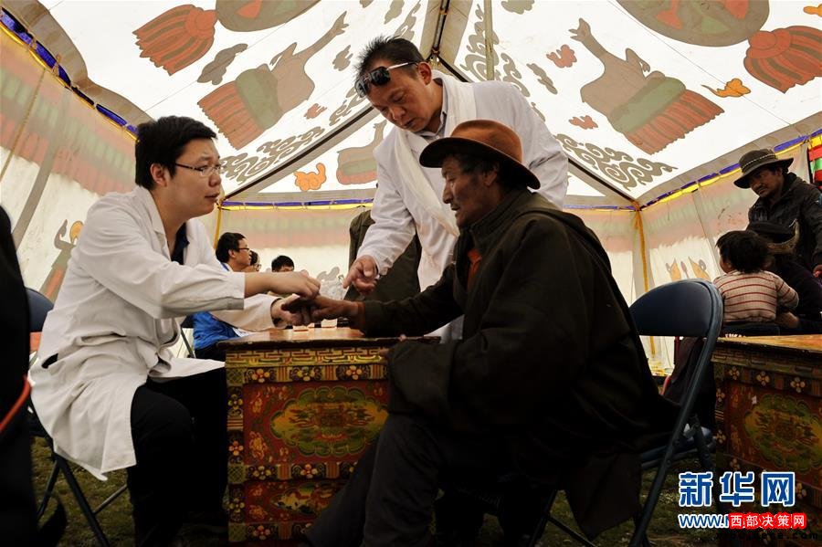 7月17日,北京大學(xué)人民醫(yī)院主治醫(yī)師劉田(左)在西藏人民醫(yī)院醫(yī)務(wù)處次仁達(dá)娃的翻譯下為巴爾卡村一名牧民查體。當(dāng)日,來(lái)自北京協(xié)和醫(yī)院、北京大學(xué)人民醫(yī)院、北京大學(xué)第三醫(yī)院等醫(yī)院的12名援藏醫(yī)療專(zhuān)家深入偏遠(yuǎn)的墨竹工卡縣門(mén)巴鄉(xiāng)巴爾卡村,為農(nóng)牧民義診。新華社記者 張汝鋒 攝
