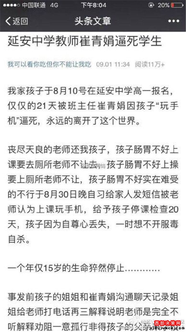 西部決策網(wǎng)訊 近日,據(jù)微博我可以看你吃但你不能讓我吃,爆料,我家孩子于8月10號在延安中學(xué)高一報名,21天被班主任崔青娟因孩子“玩手機(jī)”逼死“。
