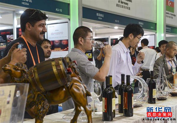 在第三屆中國(guó)—亞歐博覽會(huì)上,參觀者在格魯吉亞展區(qū)品嘗紅酒(2013年9月3日攝)。