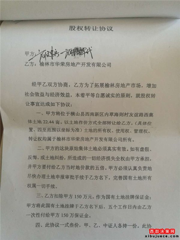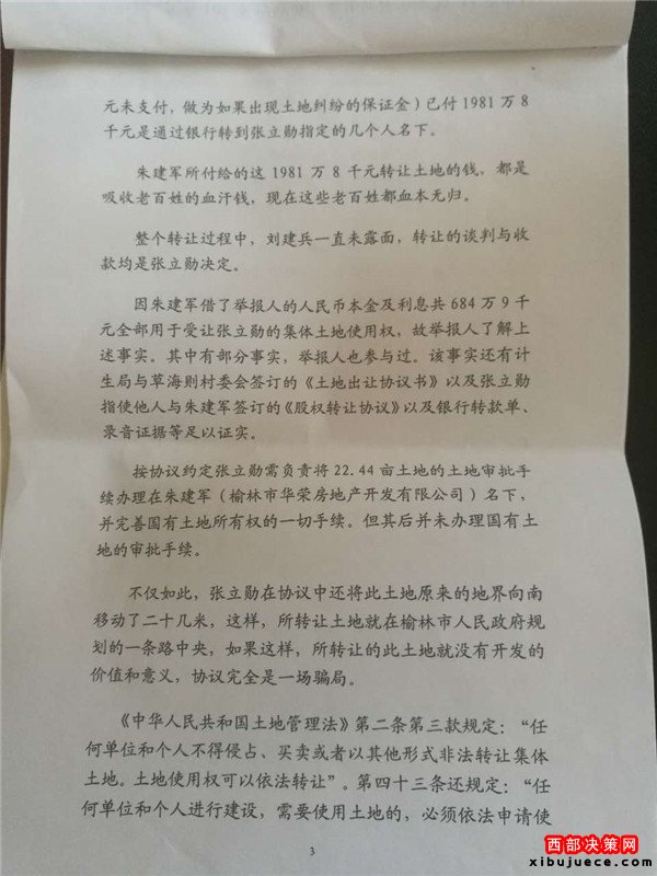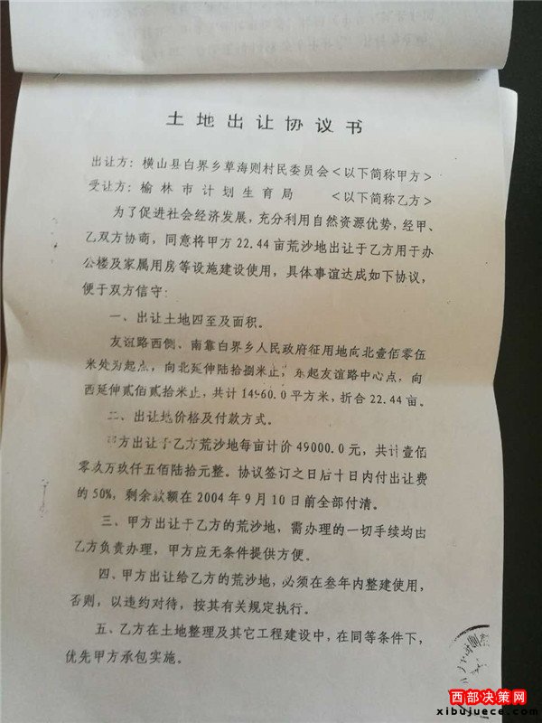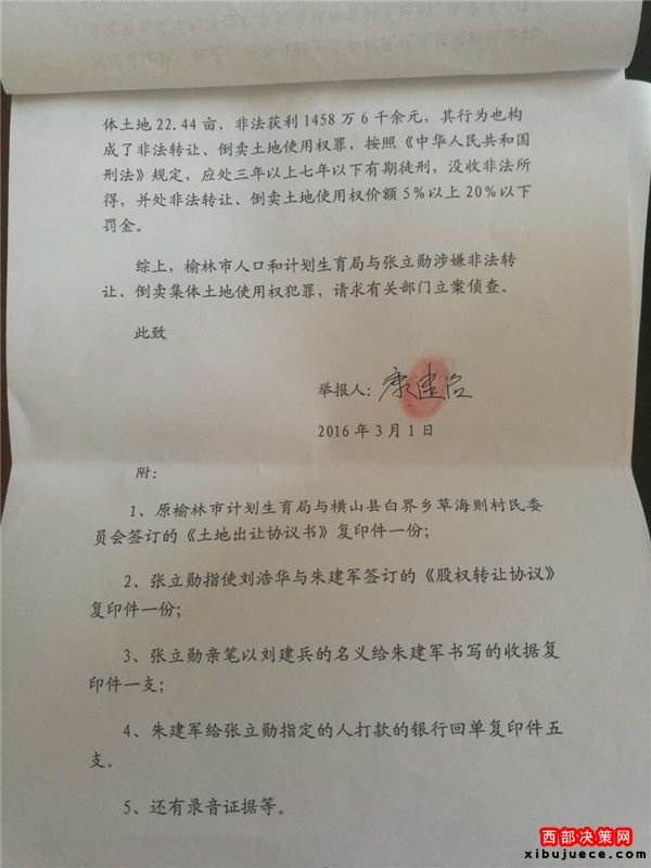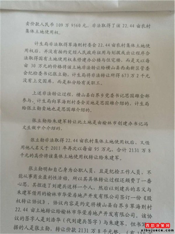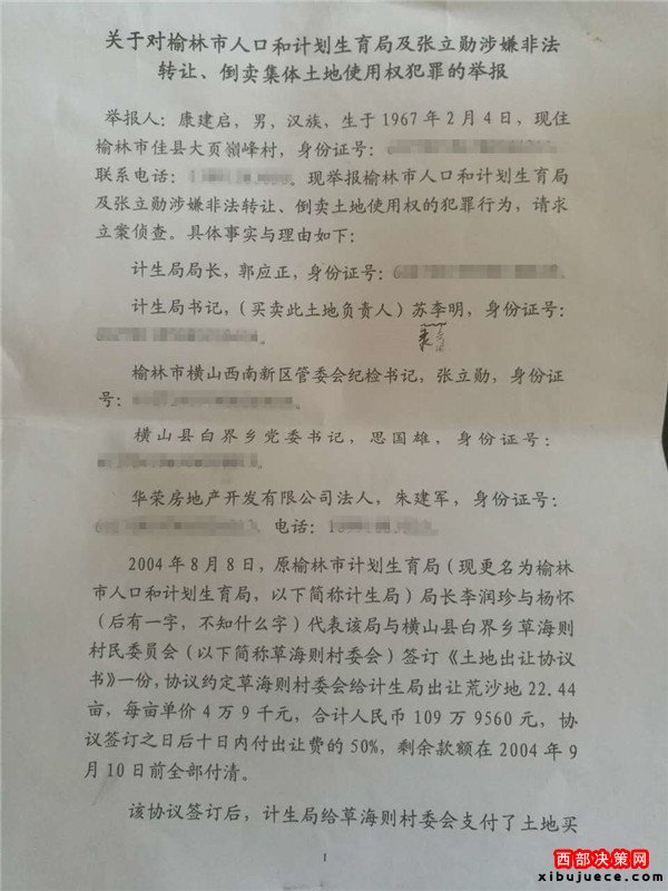 2016年9月11日本社接到:榆林市佳縣人康建啟(轉(zhuǎn)讓倒賣該土地合同的中間見證人之一)實(shí)名舉報(bào),榆林市人口和計(jì)劃生育局(郭局長、蘇書記)、榆林市橫山西南新區(qū)管委會(huì)紀(jì)檢書記張書記、橫山縣白界鄉(xiāng)黨委書記思書記(未點(diǎn)名的市級(jí)領(lǐng)導(dǎo))等等涉嫌非法轉(zhuǎn)讓、倒賣集體土地使用權(quán),從中非法獲利2021.844萬元