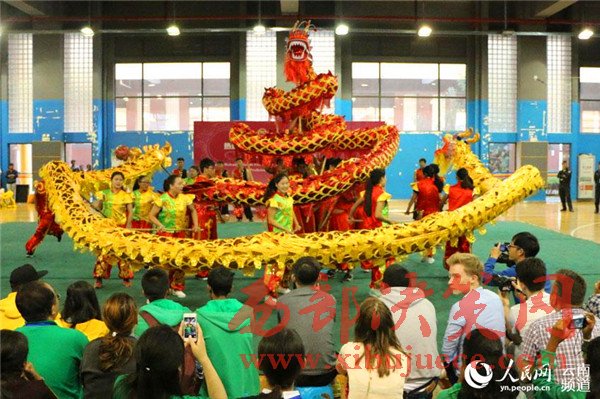 海外中學(xué)生在云南師范大學(xué)欣賞舞龍表演。