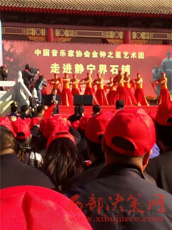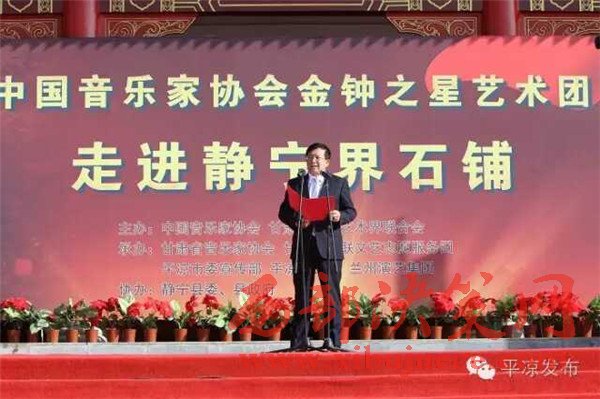 11月3日,在全國上下認真學(xué)習(xí)貫徹黨的十八屆六中全會精神、隆重紀念紅軍長征勝利80周年之際,由中國音樂家協(xié)會、甘肅省文聯(lián)主辦,甘肅省音樂家協(xié)會、甘肅省文聯(lián)文藝志愿者服務(wù)團、平?jīng)鍪形麄鞑?、平?jīng)鍪形穆?lián)承辦,靜寧縣委、縣政府協(xié)辦的“長征精神代代傳——中國音協(xié)金鐘之星藝術(shù)團‘送歡樂·下基層’慰問演出活動”在靜寧縣界石鋪紅軍長征毛澤東舊居紀念館演出。