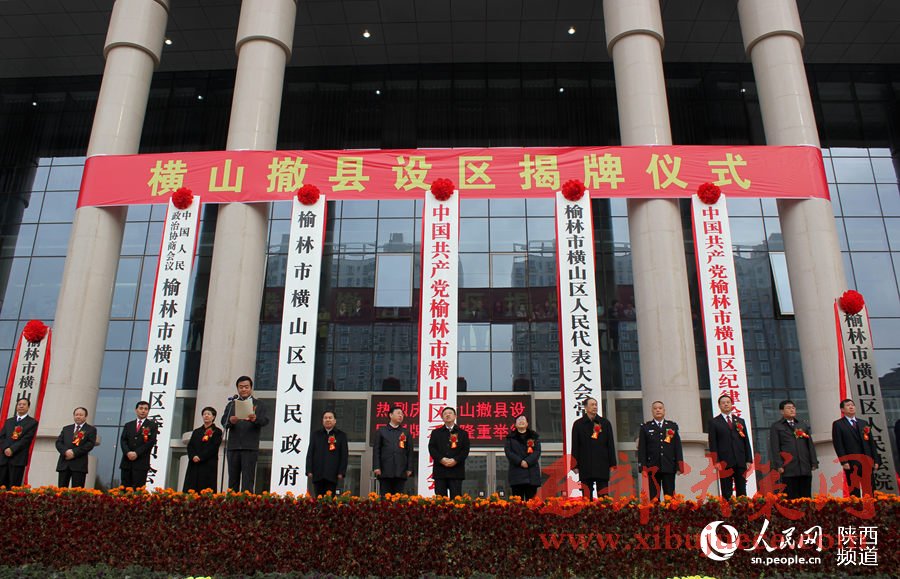 11月9日上午,橫山撤縣設(shè)區(qū)黨政干部大會(huì)暨揭牌儀式在橫山舉行。榆林市委書記胡志強(qiáng),市長尉俊東,市政協(xié)主席劉春橋,陜西省民政廳副廳長郭慧敏等出席掛牌儀式。中國共產(chǎn)黨榆林市橫山區(qū)委員會(huì)、榆林市橫山區(qū)人民政府正式掛牌。未來,榆林市行政區(qū)劃將變?yōu)?區(qū)10縣。