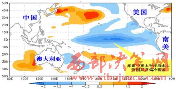 拉尼娜事件發(fā)生時海水表面溫度距平分布示意圖。(紅色表示偏暖,藍(lán)色表示偏冷,顏色越深表示偏暖或偏冷程度越強(qiáng))