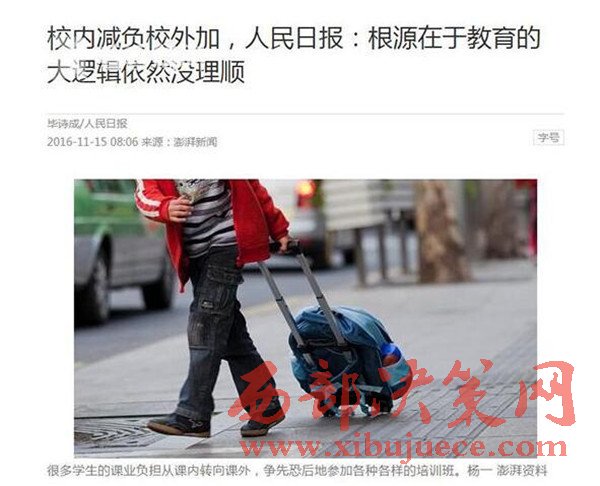 那么到底該從何思考這場學(xué)而思的瘋狂?11月15日出版的《人民日報》表示,校內(nèi)減負(fù)校外加的現(xiàn)象根源在于,教育的大邏輯依然沒有理順。文章說,如果不能將招錄制度的改革做足做透,不能將教育資源均衡化的工作咬定不放松,那么校內(nèi)減負(fù)校外加的怪現(xiàn)狀,就會變著花樣地持續(xù)上演。