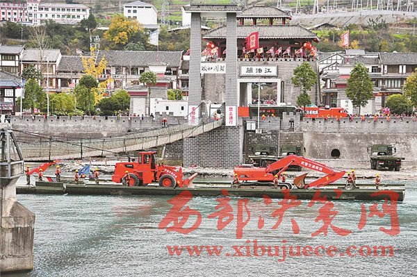 11月22日,聯(lián)合應(yīng)急演練中,我國自主研制的動(dòng)力舟橋在平武縣南壩鎮(zhèn)穿過鐵索橋。