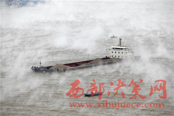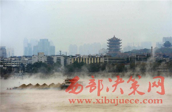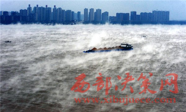 2016年11月23日,湖北武漢,寒潮帶來(lái)極速降溫后,由于江水溫度較大氣溫度高出不少,長(zhǎng)江江面上出現(xiàn)層層水霧,煙波浩渺,蔚為壯觀,放眼望去,仿佛整個(gè)城市都漂浮在云霧之中。