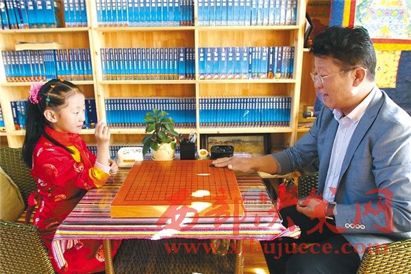 西藏自治區(qū)藏棋協(xié)會(huì)秘書長(zhǎng)阿旺邊巴正在與孩子下棋。