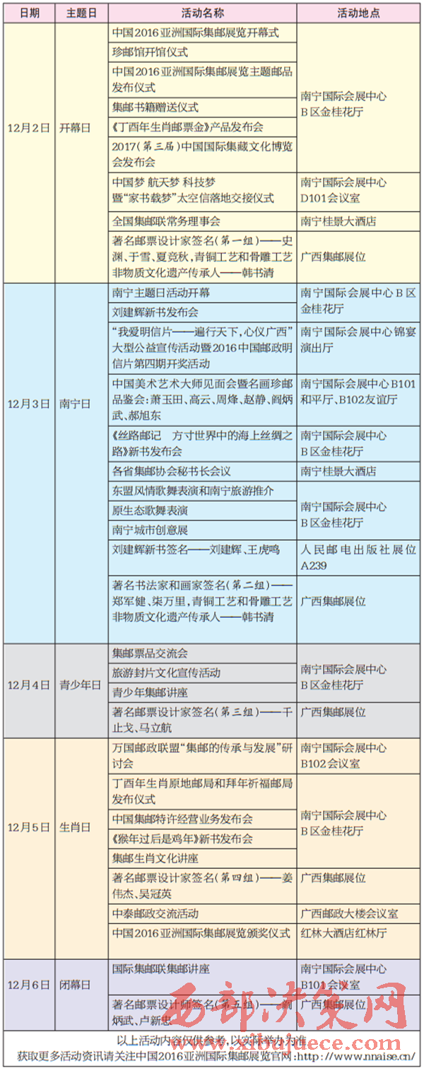 中國2016亞洲國際集郵展覽即將于12月2日—6日在南寧舉行,除了精彩的競賽性和非競賽性展品,郵展期間還將舉辦生肖郵票展示和主題郵局展示等相關(guān)活動。展會還特別設(shè)定了開幕日、南寧日、青少年日、生肖日、閉幕日五個(gè)主題日,下面就來看看每個(gè)主題日都有哪些豐富的活動吧。