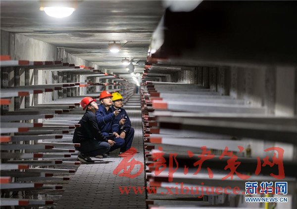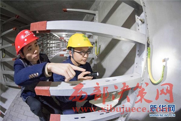 11月24日,解放碑地下環(huán)形電力隧道的一段支線電力隧道內(nèi),兩名國網(wǎng)重慶市區(qū)供電公司的技術人員(右一、右二)在對預留的商業(yè)用戶接入隧道的電力設施設備進行竣工驗收。當日,經(jīng)過3年多的緊張建設,重慶地下環(huán)形“電力高速路”——解放碑地下環(huán)形電力隧道工程順利通過竣工驗收,并正式投入運行。解放碑環(huán)形電力隧道總長2408米,其中1198米的干線電力隧道已經(jīng)成功接入解放碑商圈及周邊地區(qū)的4個110千伏變電站形成環(huán)線,支線電力隧道1210米也開始陸續(xù)接入用戶。據(jù)介紹,作為重慶市重點工程,2013年7月開工建設的解放碑地下環(huán)形電力隧道按照滿足未來20年電力需求設計,隧道高2.8米、寬2.4米,投入運行后將解決重慶渝中半島和重慶最繁華的解放碑商業(yè)區(qū)配電設施老化、無法擴建等問題,使解放碑商圈供電負荷承載能力得到極大加強。