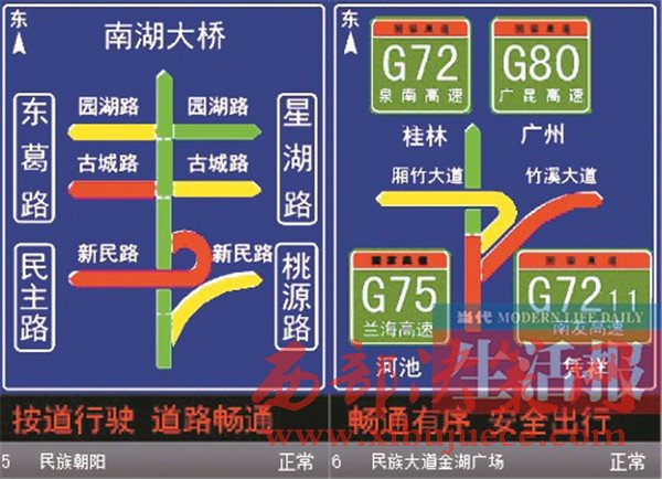“至埌東客運站旅行時間5分鐘”的提示,同時顯示周邊多條道路都是綠色……駕車在民族大道上會看到類似這樣的提示,這是南寧交警部門與高德地圖合作的成果。目前,高德地圖提供的實時路況交通信息已經(jīng)陸續(xù)上線南寧市交通誘導(dǎo)屏。在民族大道沿線的60塊誘導(dǎo)屏,均可以清楚地反映實時路況信息和道路擁堵狀況。