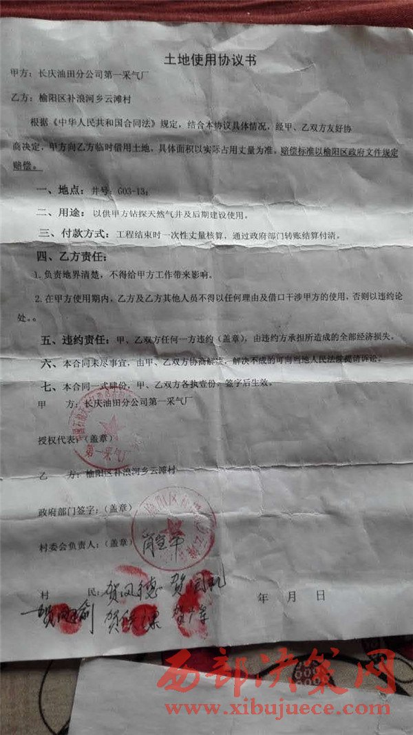 日前,陜西榆林榆陽區(qū)補(bǔ)浪河一村民反映,長慶油田采氣一廠在他們村征地鉆探天然氣井,村民懷疑長慶采氣一廠和他們村委會簽定的《土地使用協(xié)議書》存在著嚴(yán)重的問題。村民向記者看了一份所謂的巜土地使用協(xié)議書》,記者看到這份漏洞百出的協(xié)議書,協(xié)議書的甲方是長慶油田采氣一廠分公司,而協(xié)議書公章是中國石油天然氣長慶股份有限公司(……)分公司,幾個關(guān)鍵的字根本看不清楚,不知道這個沒有蓋清楚公章的協(xié)議書到底想掩蓋什么?還是這枚公章就是一枚假公章。協(xié)議書的甲方名稱為什么和公章名稱不符呢?