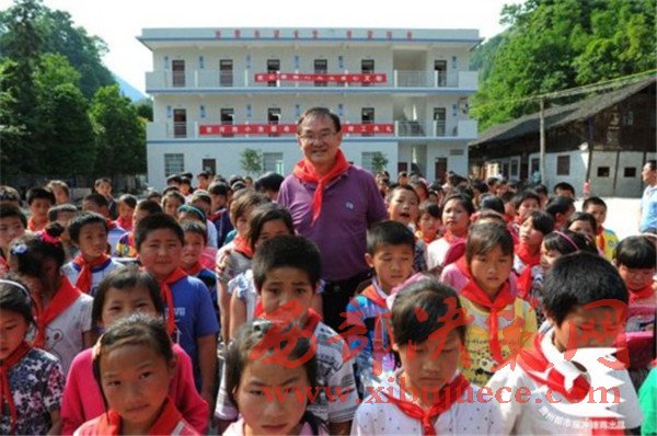 (2013年,葉其超到遵義市務川縣涪洋鎮(zhèn)雙河小學看望學生,他們身后的新樓是葉其超捐款50萬元援建的希望食堂、宿舍。)