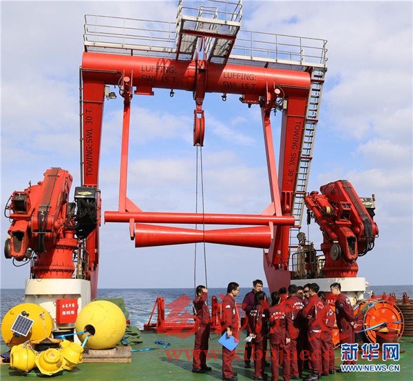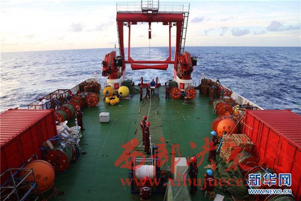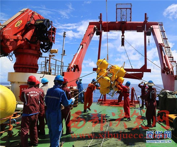在深海潛標回收作業(yè)中,潛標主浮體和玻璃浮球浮出水面(11月18日攝)。我國遠洋綜合考察船“科學”號正在西太平洋執(zhí)行潛標觀測網(wǎng)維護與升級任務。截至目前,科考隊員已獲取了140余件觀測設備連續(xù)1年的現(xiàn)場數(shù)據(jù),維護了8套深海潛標,并重新布放至西太平洋海域。