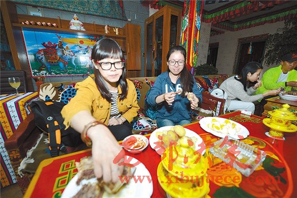 圖為來(lái)自內(nèi)地的游客正在品嘗特色藏餐。