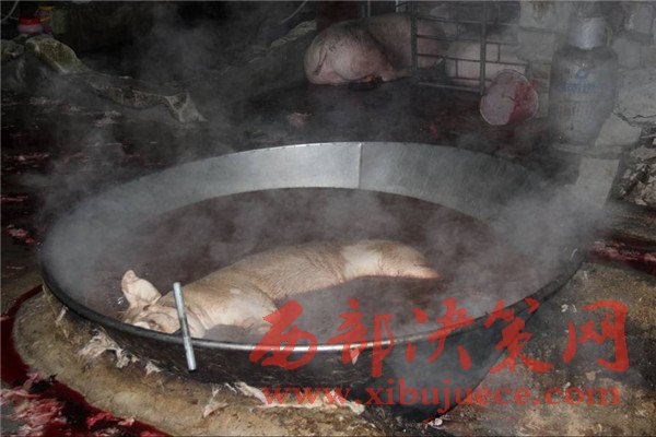執(zhí)法人員稱,這口大鍋是用來給生豬褪毛的,隨后就在這露天的骯臟環(huán)境下進(jìn)行屠宰和分割、裝填貨車,這種情況屠宰出來的豬肉其質(zhì)量可想而知。