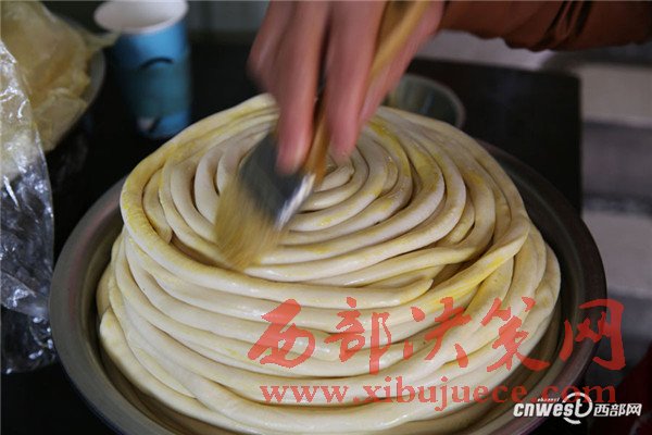 問賀玉蘭老人做得一碗好面有啥竅門,賀玉蘭老人說:“有啥竅門?實實在在做就成,一個是面要揉好、揉成光光亮亮的軟面團,揉好的面醒2個小時后就可以搓成粗條子盤放在盆子里,一層層碼放,刷上菜籽油,一個是防止面粘在一起,另外也能使面口感更爽滑,盤放好后再醒2個小時。”