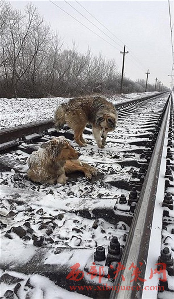 在嚴(yán)寒中,兩只狗狗在鐵軌上蜷縮了兩天,一動不動。Lucy受傷嚴(yán)重,沒法從鐵軌上挪動下來。Panda一直在她身邊保護(hù)她,用自己的身體為她保溫,當(dāng)有火車逼近時,Panda想盡辦法把Lucy的頭按下,讓火車可以在它們頭頂經(jīng)過。