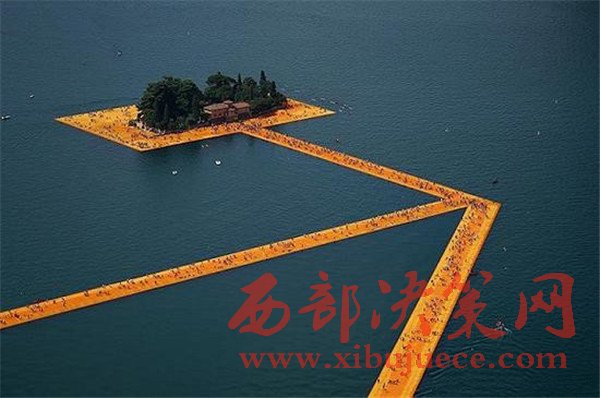 當(dāng)代概念藝術(shù)家Christo因開(kāi)拓土地藝術(shù)而聞名。在他最新的項(xiàng)目漂浮碼頭中,Christo搭建了很多亮黃色的小路,邀請(qǐng)意大利Sulzano的居民和游客步行通勤至別的導(dǎo)語(yǔ)。和Christo的其他裝置一樣,漂浮碼頭作品中的其他地方景觀也扮演著重要的角色。“湖周?chē)纳矫}提供了鳥(niǎo)瞰該作品的地點(diǎn),展現(xiàn)了那些之前沒(méi)被注意的角度”,他解釋道。“水、風(fēng)、太陽(yáng),都是這個(gè)項(xiàng)目的一部分。”