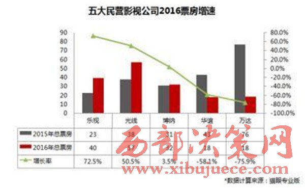 在單個(gè)公司增長(zhǎng)層面,樂視影業(yè)最為突出,2016年的票房增長(zhǎng)率達(dá)到了72.5%;光線影業(yè)2016年的票房增長(zhǎng)率達(dá)到35.9%,博納影業(yè)2016年的票房幾乎與去年持平,票房增長(zhǎng)率為3.5%;華誼兄弟影業(yè)2016年票房增長(zhǎng)率為-58.2%,萬(wàn)達(dá)影視2016年的票房增長(zhǎng)率為-75.9%,票房波動(dòng)較大。