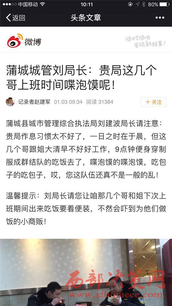 近日,有微博網(wǎng)友爆料:蒲城縣城市管理綜合執(zhí)法局部分工作人員上班著制服外出吃飯。對于這個問題,有網(wǎng)友評論說:“就吃個飯嘛!沒必要小題大做”。還有網(wǎng)友說:“貴局作息習(xí)慣太不好了,一日之時在于晨,但這幾個哥跟姐大清早不好好工作,9點(diǎn)鐘便身穿制服成群結(jié)隊(duì)的吃飯去了,咥泡饃的咥泡饃,吃包子的吃包子,哎,這隊(duì)伍還真不是一般的亂!”