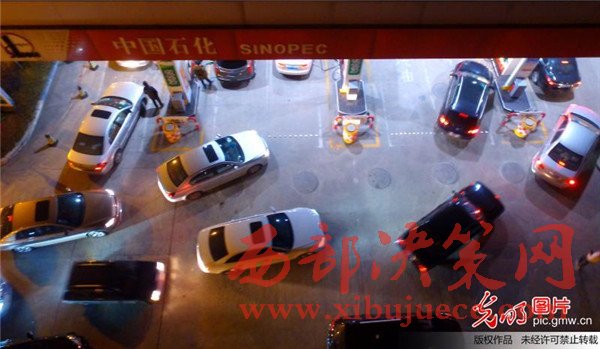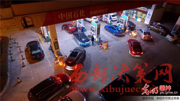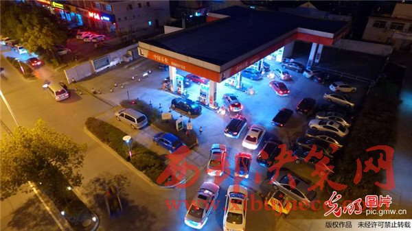 2017年1月12日晚,航拍揚(yáng)州一家加油站,車(chē)主排隊(duì)等待加油。