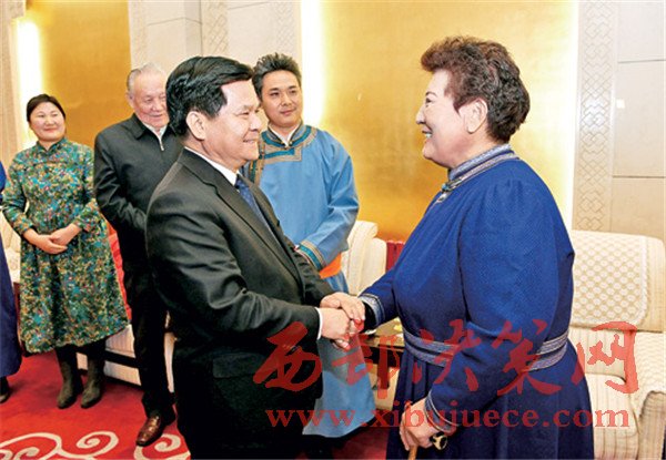 1月16日晚,自治區(qū)黨委書記李紀(jì)恒在觀看大型蒙古族歌劇《愛(ài)在胡楊》演出前,接見了總策劃德德瑪?shù)染巹?chuàng)人員。