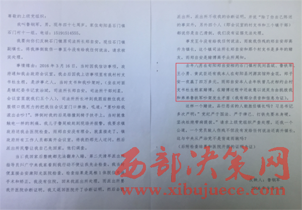 當(dāng)事人魯鋼軍于2016年3月16號在石門鎮(zhèn)政府會議室被傷,而致他受傷的當(dāng)事人鄭自安還升任石門鎮(zhèn)副鎮(zhèn)長,而這個新任鎮(zhèn)長鄭自安就是上訪人向旬陽縣委組織部實名舉報長期聚賭的主要人物。而鄭自安賭博并非偶爾賭一兩次,而是長期聚賭,鄭自安和上訪人魯鋼軍結(jié)怨就是在前幾年上訪人在上訪過程中認(rèn)識的。鄭自安讓上訪人介紹賭友認(rèn)識聚賭而對上訪人有怨氣。石門鎮(zhèn)難道是特區(qū)要以賭博產(chǎn)業(yè)為龍頭嗎?否則怎么會讓一個賭徒任鎮(zhèn)長?2016年3月16日在鎮(zhèn)政府辦公室致使魯剛軍尾椎體滑脫,造成多日生活部分失去自理能力。就因種種事由,魯剛軍曾多次向旬陽縣紀(jì)委、安康市組織部、安康市紀(jì)委反映,至今未得到妥善處理。