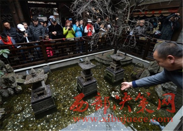中午時分,記者又一次仔細(xì)觀察了水池,在游人拋投硬幣時,確實(shí)有一兩條金色的觀賞魚在石縫處游動著。在木制欄桿四周,正貼著“禁止倚靠欄桿”、“禁止投幣”等字樣。“春節(jié)游客爆滿,水池是從寬巷子到窄巷子的必經(jīng)之道,加上很多人在拋硬幣,頓時人滿為患。我們只好打印了幾張?zhí)嵝褟堎N起來。”辦公室工作人員還表示,“等春節(jié)游客潮稍微退卻,天氣回暖,我們就要派人下水打撈這些硬幣,用于景點(diǎn)建設(shè)。”
