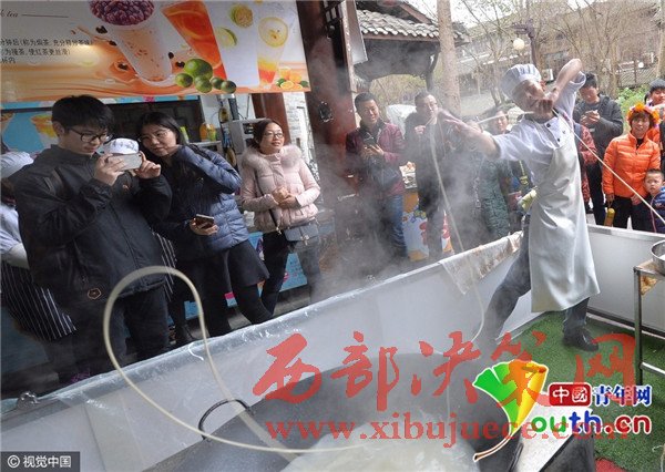 "我當時就想著搞點花樣,來招攬客人。"田波告訴記者,一開始他只是簡單地扭幾個動作,把原來扯面的動作,變得更花哨。