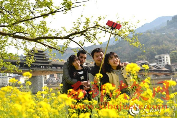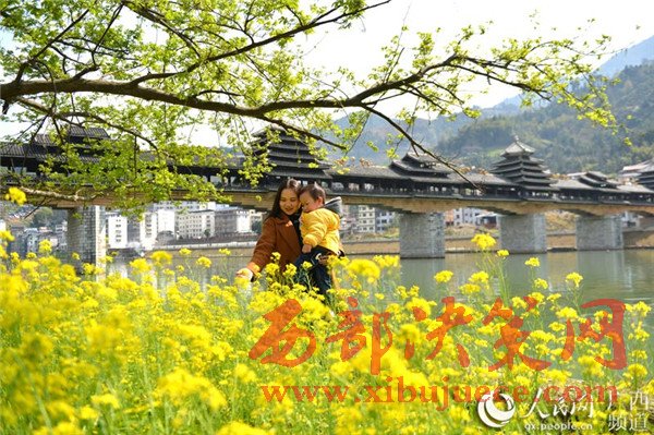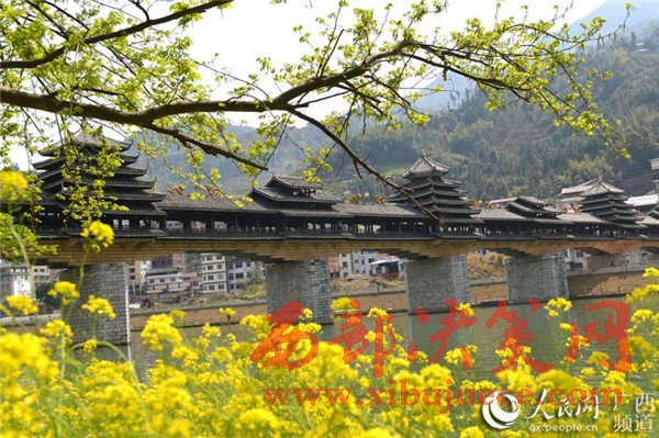 春暖花開時(shí)節(jié),廣西龍勝各族自治縣民族風(fēng)雨橋旁的油菜花競相綻放,風(fēng)雨橋在油菜花的點(diǎn)綴下美不勝收,形成了一道美麗的春天景致,充滿著濃郁的春天氣息,吸引眾多游客前來觀賞拍照。