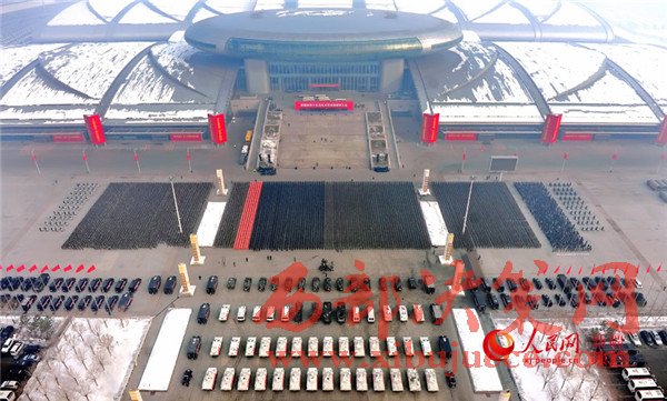 新疆國際會(huì)展中心廣場(chǎng)上,1萬余名武警官兵、公安民警、民兵預(yù)備役人員等各維穩(wěn)力量緊握鋼槍盾牌、整齊列隊(duì)挺立,直升機(jī)在空中盤旋,一輛輛軍車、裝甲車、摩托車列隊(duì)待發(fā)。