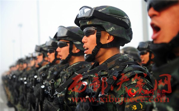 參加喀什地區(qū)反恐維穩(wěn)誓師大會(huì)的武警官兵高喊口號(hào)奮勇向前。