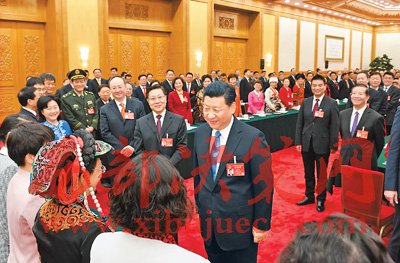 3月8日,中共中央總書記、國家主席、中央軍委主席習(xí)近平參加十二屆全國人大五次會(huì)議四川代表團(tuán)的審議。在“三八”國際勞動(dòng)?jì)D女節(jié)到來之際,習(xí)近平代表黨中央、國務(wù)院,向參加全國兩會(huì)的女代表、女委員、女工作人員,向全國各族各界婦女同胞,致以節(jié)日的祝賀和誠摯的祝福。這是習(xí)近平同女代表親切交談。