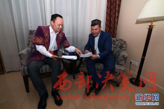 3月7日晚,民族語文翻譯組工作人員包烏爾江(左)和別爾克努爾在討論文件翻譯。
