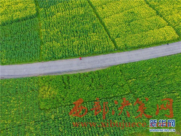 3月12日,在湖南省湘西土家族苗族自治州龍山縣召市鎮(zhèn),行人在油菜花田間的道路上行走。