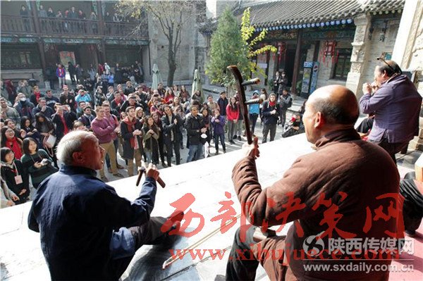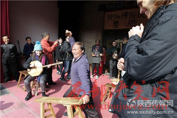 11月15日,北京大學(xué)燕京學(xué)堂的丹麥、以色列等42個國家的100多名外國留學(xué)生,來到西安了解中國傳統(tǒng)文化和城市發(fā)展及變化,在關(guān)中民俗藝術(shù)博物院,“老外”對華陰老腔產(chǎn)生濃厚興趣,現(xiàn)場向老藝人學(xué)唱華陰老腔。