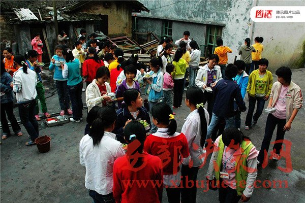 圖為2007年4月29日,福建龍巖市上杭縣蛟洋中學,由于餐桌有限,大部分學生只能在室外站著用餐。