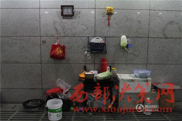 當(dāng)日,武漢市救助管理站的4名工作人員來過,他們勸流浪漢們?nèi)ゾ戎疚此?,只好給流浪漢們送來了被子和襖子。圖為流浪漢的廚房。