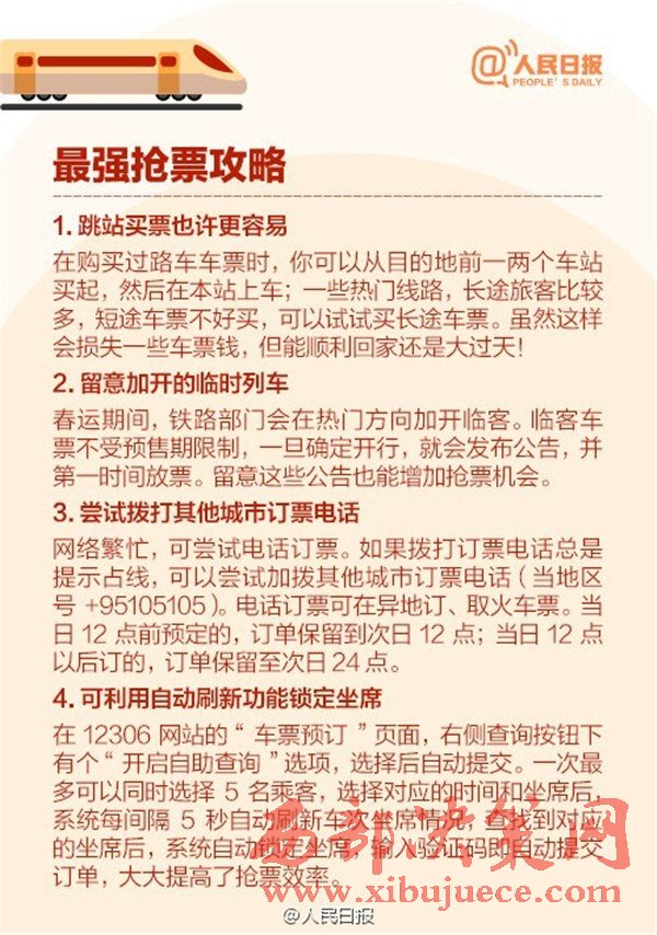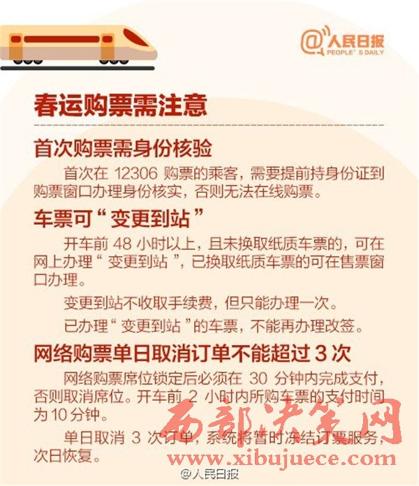 2017年春運從1月13日至2月21日,是近5年來開始時間最早的春運,你做好搶票準備了嗎?目前火車票預售期30天,除夕當天的票12月29日開搶,網(wǎng)絡購票須在30分鐘內付款,發(fā)車前2天或12小時可“撿漏”。
