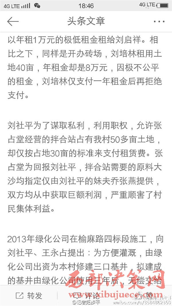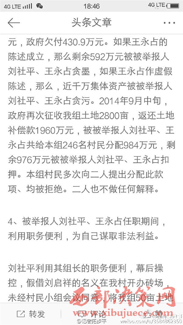 近日有微博網(wǎng)友飆新聞微博爆料:自被舉報(bào)人劉社平、王永占二人任職以來,一手把持組委,視組委為自家私有權(quán)力,從來不向組民公布賬務(wù)。他們不但不為組民謀利,反而利用職務(wù)便利將村民集體數(shù)千萬財(cái)產(chǎn)據(jù)為己有。請(qǐng)相關(guān)部門調(diào)查回復(fù)!