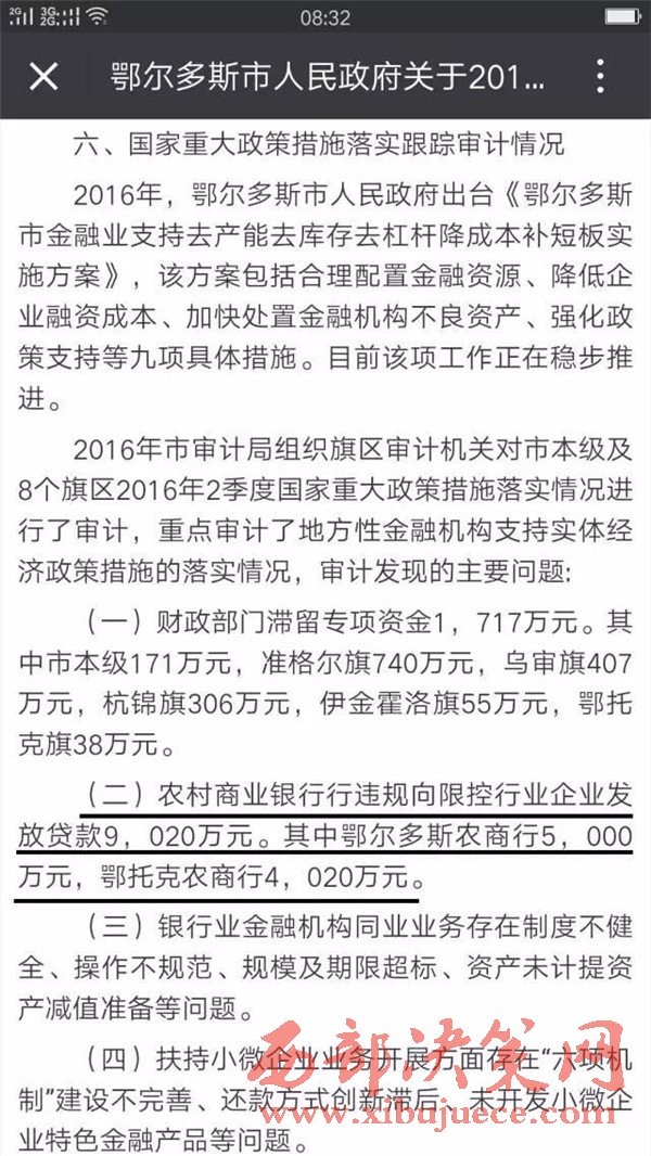 鄂爾多斯市人民政府網(wǎng)站刊登文章中稱:按照審計(jì)署統(tǒng)一安排部署,鄂爾多斯市審計(jì)局在第二季度國(guó)家重大政策措施落實(shí)情況跟蹤審計(jì)中對(duì)鄂爾多斯農(nóng)村商業(yè)銀行在扶持小微企業(yè)這一政策落實(shí)情況進(jìn)行了審計(jì)。