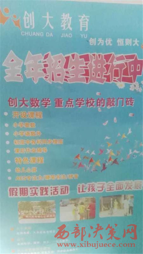 家長為了讓孩子能全面發(fā)展,常年穿梭于各類興趣、輔導班而樂此不疲。有的家長為了讓孩子上個好學校,托熟人、找關系,掏天價送孩子上所謂的名優(yōu)輔導機構,而實際上實屬無奈,敢恨不敢言,這一現(xiàn)象不得不讓人深思……!實際情況到底怎樣?本社工作人員根據(jù)群眾反映近期對一家名為“創(chuàng)大教育”的輔導班進行實地了解,結果讓人大跌眼鏡。