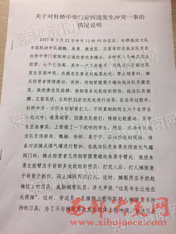 當晚6點以后,涉事執(zhí)法隊員所屬執(zhí)法大隊杜橋執(zhí)法大隊書面回復便在網(wǎng)絡中被網(wǎng)友們不斷的轉(zhuǎn)載。據(jù)該回復稱:2017年3月22日中午12時40分左右,杜橋執(zhí)法大隊市容機動中隊謝鵬、朱勇、康忠民、王苗等4名執(zhí)法隊員在杜橋中學門前取締占道經(jīng)營飲食攤點,當時有八個攤點在此經(jīng)營,七個已勸離,其中一戶不愿離開,與執(zhí)法隊員康忠民發(fā)生言語沖突,在康忠民要求其搬離此處,禁止銷售時,攤點經(jīng)營者情緒激動,突然,用鋼管圓凳子砸向執(zhí)法隊員康忠民,致使康忠民胳膊、背部等多處軟組織損傷,執(zhí)法隊員謝鵬、王苗等見狀,立即趕到康忠民處進行勸導,在勸導過程中,杜橋中學一名學生說城管打人,不明真相的約五六十名學生一起起哄、謾罵城管,因康忠民被打,情緒比較激動,見學生歪曲事實,上前推了一下起哄的學生,隨后,機動中隊執(zhí)法隊員朱勇、陳新亮、魏楠、徐嬌、姜寧寧、孫偉珍趕到現(xiàn)場,準備對該攤點煤氣罐進行暫扣,在執(zhí)法隊員朱勇關閉液化氣罐閥門時,攤點經(jīng)營者用鋼管圓凳砸向朱勇手臂處,致使朱勇左前臂及手背部多處軟組織損傷,打完人后,打人攤販妻子將凳子抓住,阻止攤販再次打人,這時,攤販用左手抓起攤位上的刀具,威脅城管隊員,并大聲說“這是市長讓他在此擺攤”,這時,旁邊另一名攤販上前奪取打人攤販左手所持的刀具;為了不與攤販再次發(fā)生肢體上的沖突,執(zhí)法隊員王苗撥打110報警,在警察到現(xiàn)場之前,攤販與執(zhí)法隊員一直僵持;警察趕到現(xiàn)場后,與商販進行交涉,這時,商販亮出了精神病證,警察看后,把執(zhí)法隊員叫到一旁,告知執(zhí)法隊員此人有精神?。昏b于這種情況,執(zhí)法隊員依據(jù)法律法規(guī),將該攤點煤氣罐進行暫扣,并將暫扣單交于打人商販的妻子,隨后,警察要求執(zhí)法隊員撤離現(xiàn)場,對當事人進行教育。
