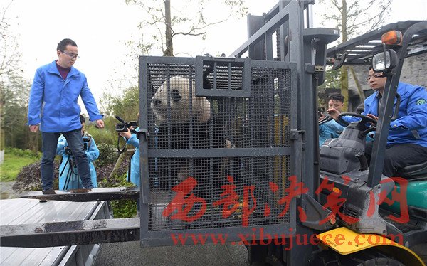 3月24日,工作人員在中國大熊貓保護研究中心都江堰基地隔離檢疫區(qū)準(zhǔn)備將大熊貓“寶寶”搬運至盼盼園。