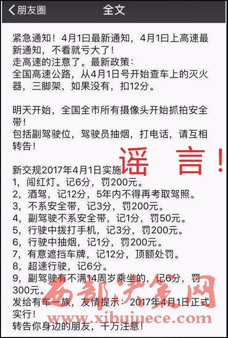 1.【謠言】“4月1日起高速上查車,沒(méi)有滅火器扣12分;同時(shí)新交規(guī)開(kāi)始實(shí)施……”近日,這則關(guān)于“4月1日起新交通法規(guī)將實(shí)行”的消息出現(xiàn)在多地網(wǎng)民的微信朋友圈中。在網(wǎng)傳的消息中,“不系安全帶記3分、罰200元,副駕駛不系安全帶記1分、罰50元,行駛中撥打手機(jī)記3分、罰200元,行駛中抽煙記1分、罰200元……”種種條款讓網(wǎng)民頗為緊張。