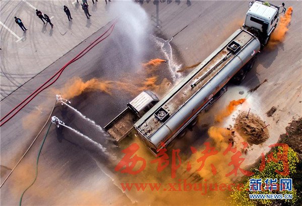 4月6日,參加演練人員對危化品運輸車輛“交通事故”現(xiàn)場進(jìn)行處置。