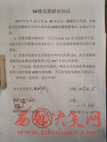 最新進展:4月15日,業(yè)主委員會和凱躍物業(yè)達成維修協(xié)議,業(yè)委會配合物業(yè)在一月之內(nèi)完成2/3 業(yè)主的簽字工作,電梯維修費使用大修資金。如果在規(guī)定時間內(nèi)達不到2/3業(yè)主簽字,則使用小區(qū)2017年的公共營收。三方協(xié)議達成后,由凱躍物業(yè)盡快聯(lián)系電梯維修公司,十日內(nèi)恢復(fù)電梯的正常運行。