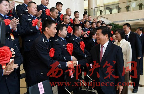 自治區(qū)黨政辦公區(qū)會議中心一樓大廳內(nèi),全國公安系統(tǒng)英雄模范立功集體內(nèi)蒙古受獎單位代表和個人著裝整齊、精神抖擻,胸前的榮譽獎章和大紅花格外醒目。在熱烈的掌聲中,李紀恒等來到代表們中間,同大家熱情握手,親切交流,并合影留念。李紀恒深情地說,看到你們一個個英姿颯爽、氣宇軒昂的樣子,我很受感染和鼓舞;聽到你們一件件舍生忘死、感人肺腑的事跡,我很受感動和教育。希望大家珍惜榮譽、再接再厲,繼續(xù)發(fā)揮示范帶動和榜樣引領(lǐng)作用,激勵全區(qū)公安機關(guān)和公安隊伍更好擔負起黨和人民賦予的重大使命。