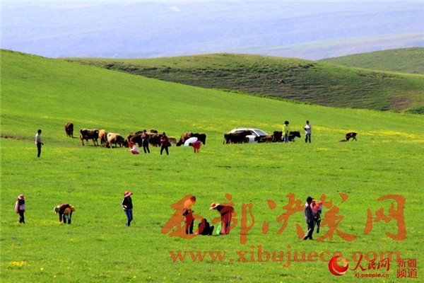 5月29日,游客在新疆裕民縣巴爾魯克山風景區(qū)阿克喬克草原踏青賞花。
